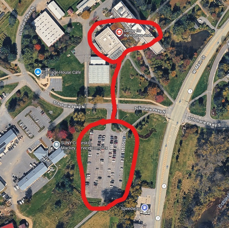 The event will be held in room 101 of the SUNY Cobleskill Center for Agriculture and Natural Resources (CANR), circled at the top of the map.